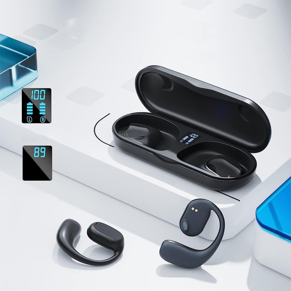 سماعة رياضية بلوتوث سماعات أذن لاسلكية حقيقية بتقنية بلوتوث 5.4، تصميم أذن مفتوحة يضمن راحة فائقة دون ألم مع صوت ستيريو ثلاثي الأبعاد عالي الجودة. مناسبة للجري، ركوب الدراجات، والعمل اليومي مع علبة شحن بشاشة LED وبطارية تدوم حتى 32 ساعة.